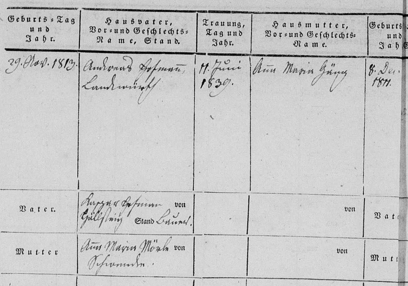 • Inhaber: Augsburger Hof, Zwischen 1848 und 1875, Höllsteig. • Beruf: Landwirt: Höllsteig. Andreas heiratete Anna Maria Geng im Jahr 1839 in ^Höllsteig. (Anna Maria Geng wurde geboren am 8 Dez. 1811 in Oberndorf.) |