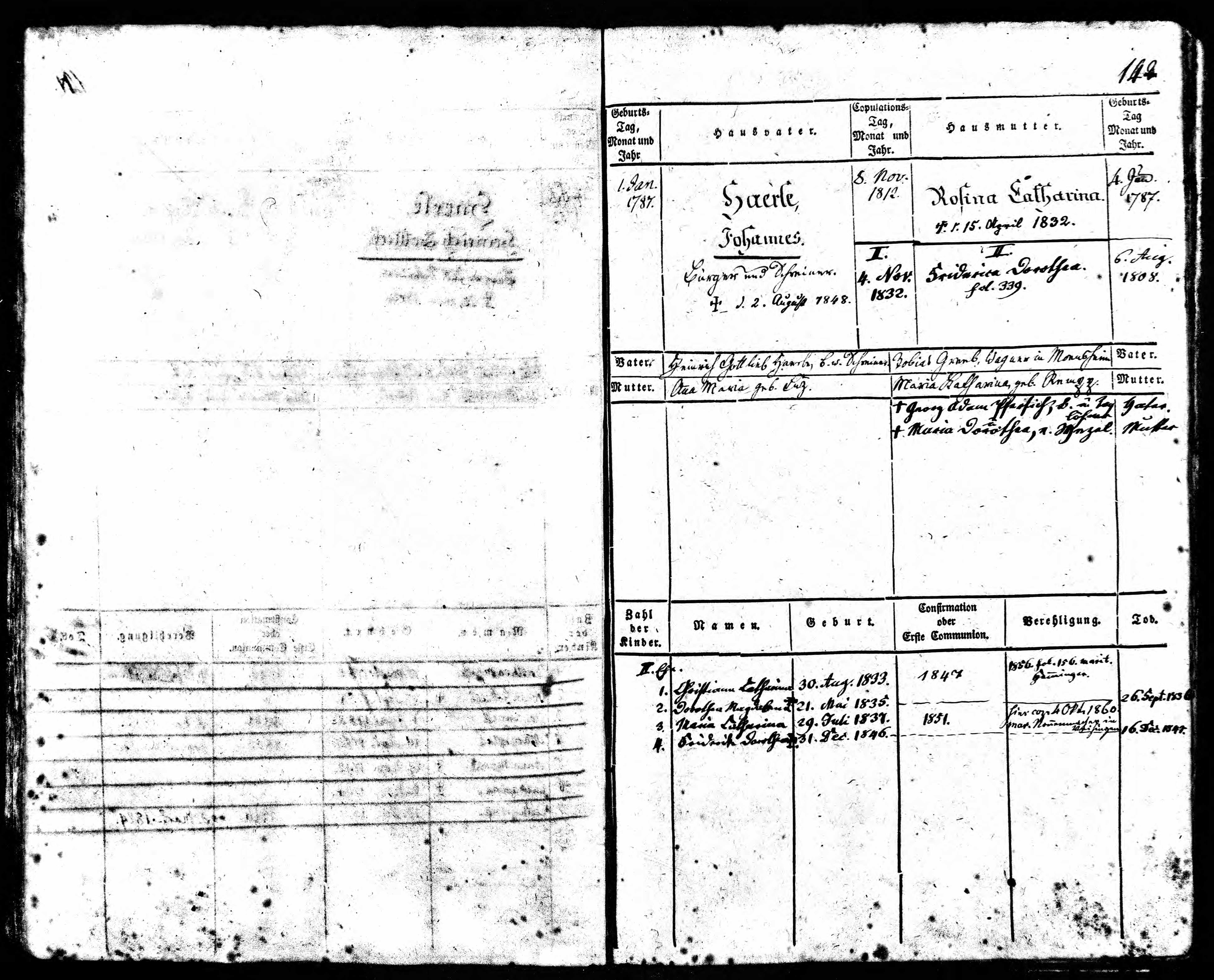 Johannes heiratete Catharina Rosina Greb, Tochter von Tobias Greb und Maria Catharina Rempp, am 8 Nov. 1812 in Evangelisch, Sersheim, Neckarkreis, Wuerttemberg. (Catharina Rosina Greb wurde geboren am 4 Jan. 1787 in Mönsheim, Leonberg, Neckarkreis, Württemberg und wurde getauft am 4 Jan. 1787 in Mönsheim, Leonberg, Neckarkreis, Württemberg.) |