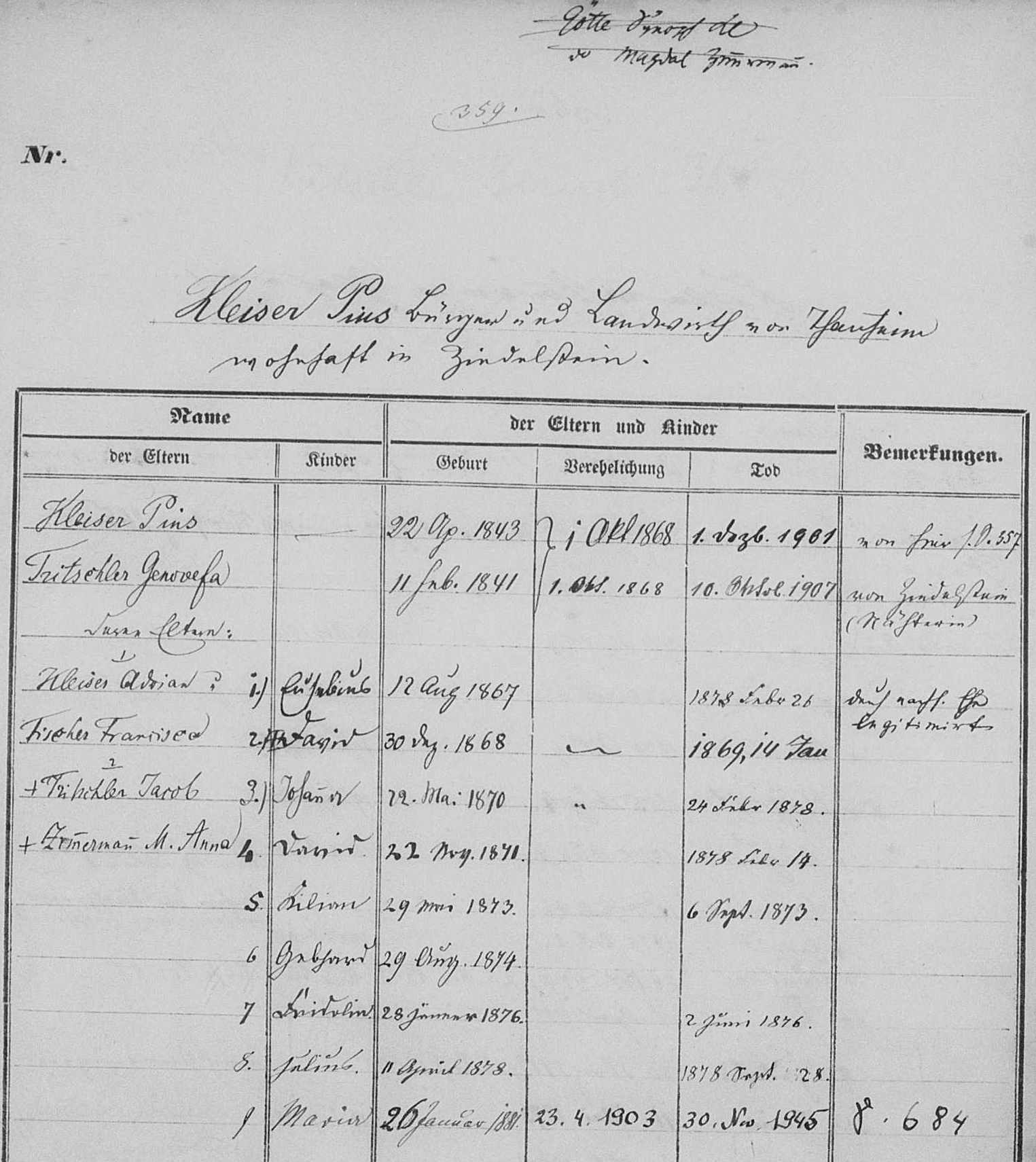- Ehe (1): Genovefa Tritschler am 1 Okt. 1868 in Tannheim (^Zindelstein)