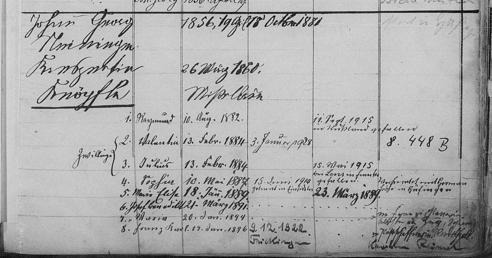 Johann heiratete Kreszentia Knöpfle am 18 Okt. 1881 in Tannheim. (Kreszentia Knöpfle wurde geboren am 26 März 1860 in Mistelbrunn, Bräunlingen, Schwarzwald-Baar-Kreis, Baden-Württemberg, Deutschland und starb am 16 Okt. 1942 in Hüfingen, Schwarzwald-Baar-Kreis, Baden-Württemberg, Deutschland.)