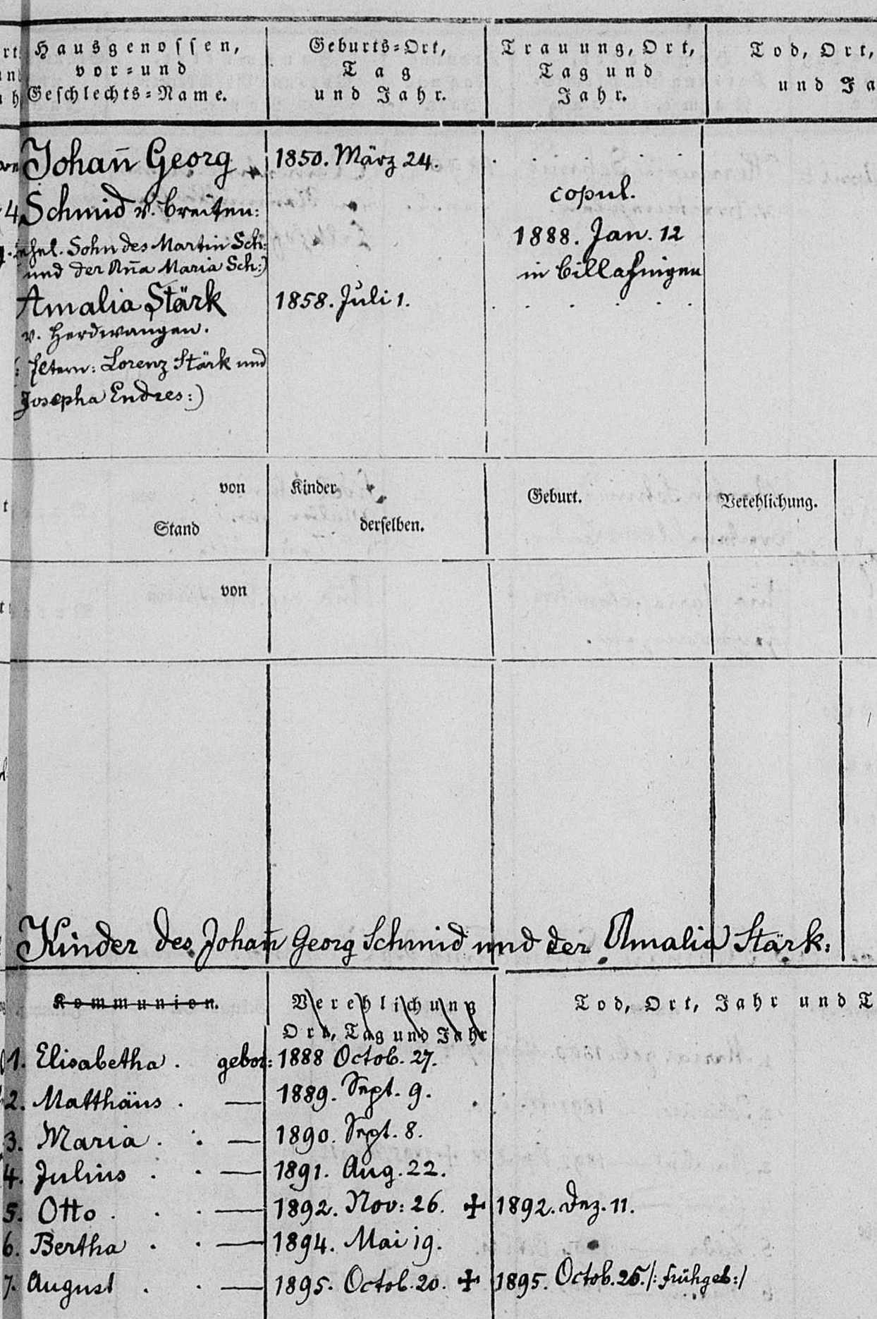 Johann heiratete Amalia Stärk, Tochter von Lorenz Stärk und Unbekannt, am 12 Jan. 1888 in Billafingen (^Breitenehrlen). (Amalia Stärk wurde geboren am 1 Jul. 1858 in Herdwangen und wurde getauft am 3 Jul. 1858 in Herdwangen.)