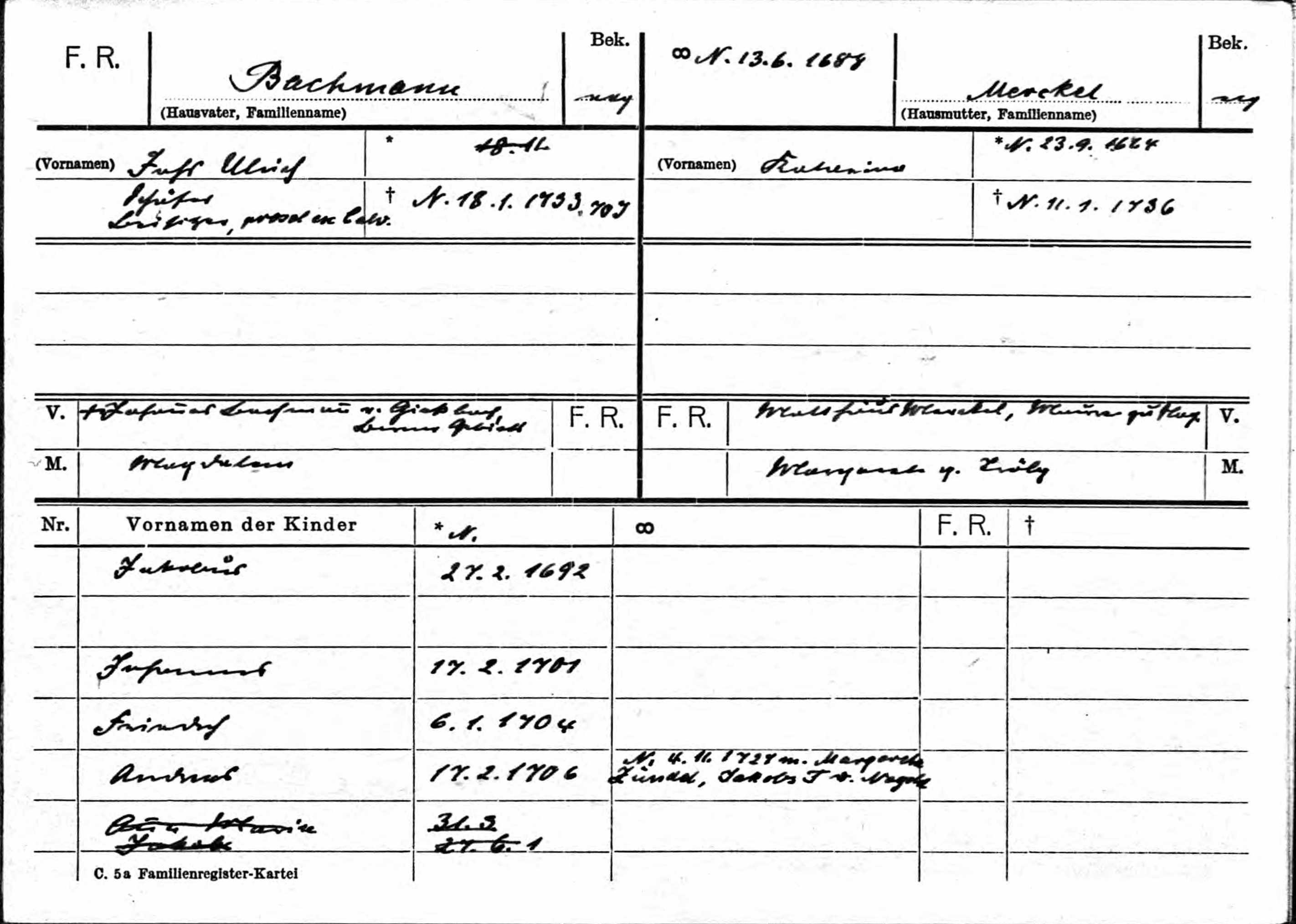 Maria heiratete Johannes Ulrich Bachmann, Sohn von Johannes Bachmann und Magdalena Bachmann*, am 13 Jun. 1688 in Nagold. (Johannes Ulrich Bachmann wurde geboren am 9 Sep. 1660 in Dießbach, Kanton Bern, Schweiz und starb am 18 Jan. 1733 in Nagold.) |