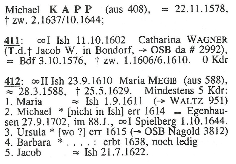 - Ehe (2): Maria Megiß am 23 Sep. 1610 in Iselshausen, Nagold, Schwarzwaldkreis, Württemberg