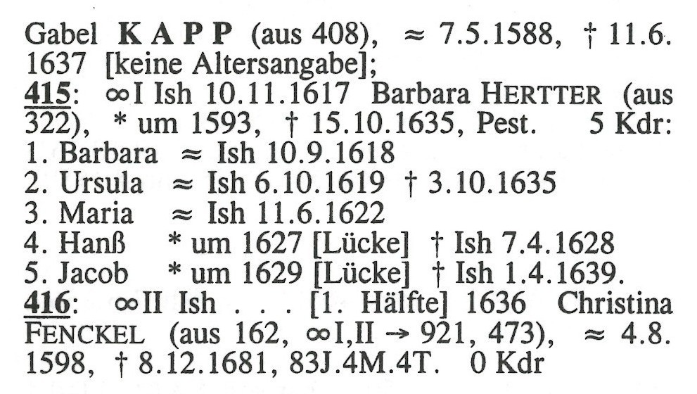 - Ehe (1): Barbara Hertter am 10 Nov. 1617 in Iselshausen, Nagold, Schwarzwaldkreis, Württemberg