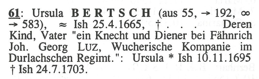 Ursula hatte eine Beziehung mit Andreas Frible. Ursula heiratete als nächstes Michael Maurer am 7 Feb. 1702 in Iselshausen, Nagold, Schwarzwaldkreis, Württemberg. (Michael Maurer wurde geboren am 13 Apr. 1675 in Nagold und starb am 3 Okt. 1748 in Nagold.) |