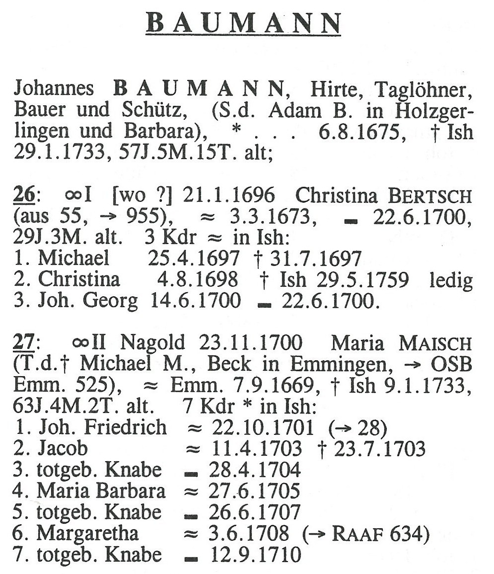 • Beruf: Hirte, Taglöhner, Bauer, Schütz: Iselshausen, Nagold, Schwarzwaldkreis, Württemberg. Johannes heiratete Christina Bertsch, Tochter von Michael Bertsch und Anna Maria Teutsch, am 21 Jan. 1696 in Iselshausen, Nagold, Schwarzwaldkreis, Württemberg. (Christina Bertsch wurde geboren am 3 März 1673 in Iselshausen, Nagold, Schwarzwaldkreis, Württemberg, getauft am 3 März 1673 in Iselshausen, Nagold, Schwarzwaldkreis, Württemberg und starb am 22 Jun. 1700 in Iselshausen, Nagold, Schwarzwaldkreis, Württemberg.) |