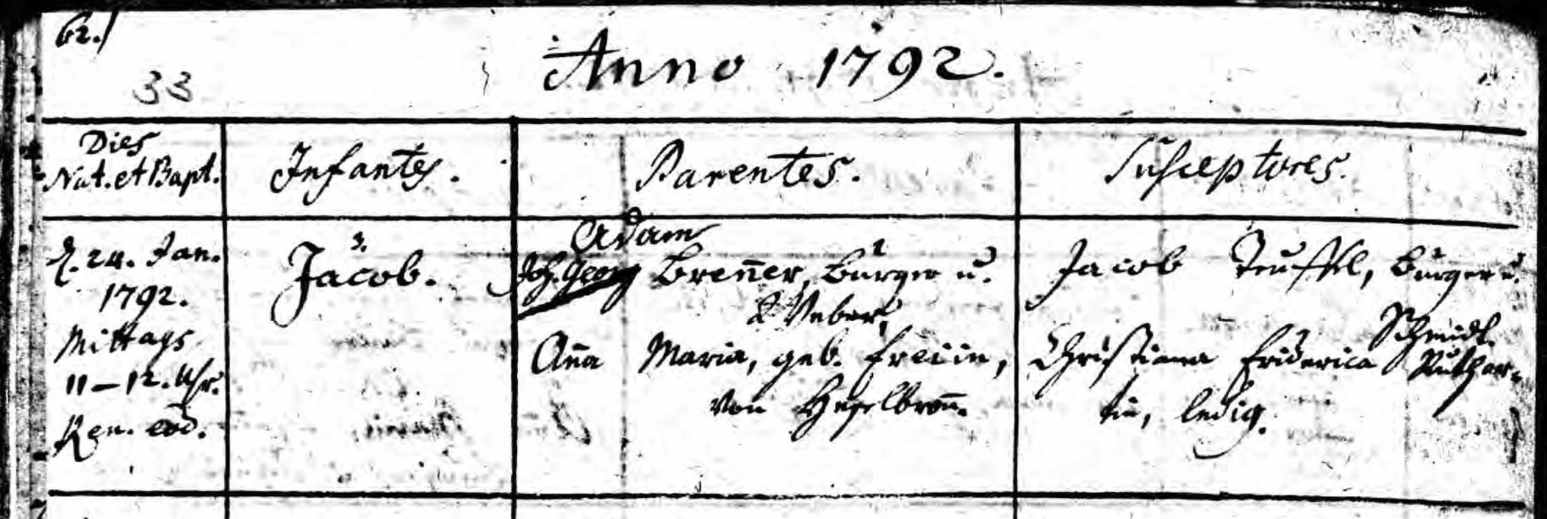 Jacob heiratete Catharina Rothfuss am 6 Mai 1817 in Egenhausen, Schwarzwaldkreis, Wuerttemberg. (Catharina Rothfuss wurde geboren am 27 Jun. 1795 in Egenhausen, Schwzw., Wurt. und starb am 25 Jul. 1836.) |