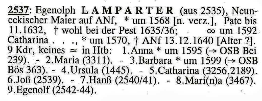 • Beruf: Neuneckischer Maier: Altnuifra, Nagold, Schwarzwaldkreis, Württemberg. Egenolph heiratete Catharina Lamparter* um 1592. (Catharina Lamparter* wurde geboren um 1570 und starb am 13 Dez. 1640 in Altnuifra, Nagold, Schwarzwaldkreis, Württemberg.) |