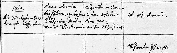 Anna heiratete Johann Bischoff, Sohn von Johann Georg Bischoff und Helena Keller, am 7 Feb. 1790 in Nesselwangen. (Johann Bischoff wurde geboren am 4 Apr. 1753 in Nesselwangen, starb am 13 Nov. 1826 in Nesselwangen und wurde bestattet am 16 Nov. 1826 in Nesselwangen.) |