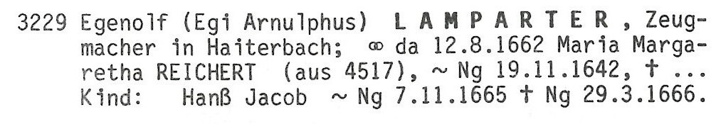 • Beruf: Zeugmacher: Haiterbach. Egenolf heiratete Maria Margaretha Reichert, Tochter von Hans Reichert und Anna Reichert*, am 12 Aug. 1662 in Haiterbach, Nagold, Schwarzwaldkreis, Württemberg. (Maria Margaretha Reichert wurde geboren am 19 Nov. 1642 in Nagold, getauft am 19 Nov. 1642 in Nagold und starb am 15 Dez. 1694 in Haiterbach, Nagold, Schwarzwaldkreis, Württemberg.) |