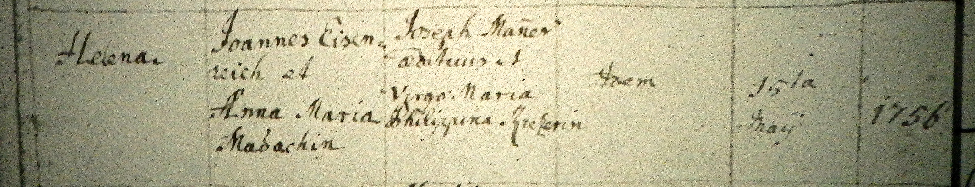 Gestorben mit 59 Jahren 6 Monaten. Helena heiratete Gabriel Blum, Sohn von Johann Blum und Maria Anna Bierenbaum, am 12 Nov. 1777 in Nesselwangen. (Gabriel Blum wurde geboren am 18 Feb. 1751 in Beurenhof bei Billafingen und starb am 6 Dez. 1815 in Nesselwangen.) |
