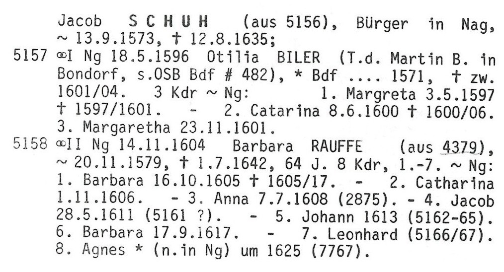 Geboren: 13 Sep. 1573 - Nagold Getauft: Gestorben: 12 Aug. 1635 - Nagold Bestattet:Ehepartner: Otilia Biler Ehe: 18 Mai 1596 - NagoldEhepartner: Barbara Rauffe Ehe: 14 Nov. 1604 - Nagold
