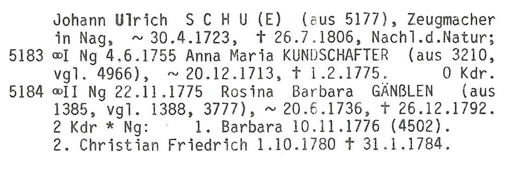 Geboren: 30 Apr. 1723 - Nagold Getauft: Gestorben: 26 Jul. 1806 - Nagold Todesursache: Nachlassen der Natur Bestattet:Ehepartner: Anna Maria Kundschafter Ehe: 4 Jun. 1755 - NagoldEhepartner: Rosina Barbara Gänßlen Ehe: 22 Nov. 1775 - Nagold