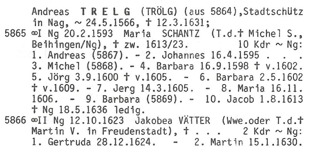 Geboren: 24 Mai 1566 - Nagold Getauft: Gestorben: 12 März 1631 - Nagold Bestattet:Ehepartner: Maria Schantz Ehe: 20 Feb. 1593 - NagoldEhepartner: Jacobea Vätter Ehe: 12 Okt. 1623 - Nagold