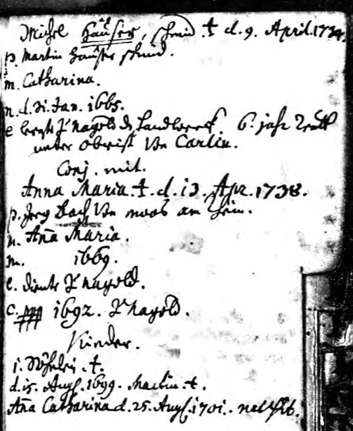 Geboren: 28 Sep. 1712 - Obersiggingen Getauft: 28 Sep. 1712 - Deggenhausen Gestorben: 16 März 1757 - Obersiggingen Bestattet: 16 März 1757 - DeggenhausenEhepartner: Anastasia Lugert Ehe: 11 Mai 1739 - Deggenhausen (^Obersiggingen)Ehepartner: Anna Maurer Ehe: 30 Sep. 1749 - Deggenhausen (^Obersiggingen)Ehepartner: Catharina Hiestend Ehe: 30 Aug. 1756 - Deggenhausen (^Obersiggingen)