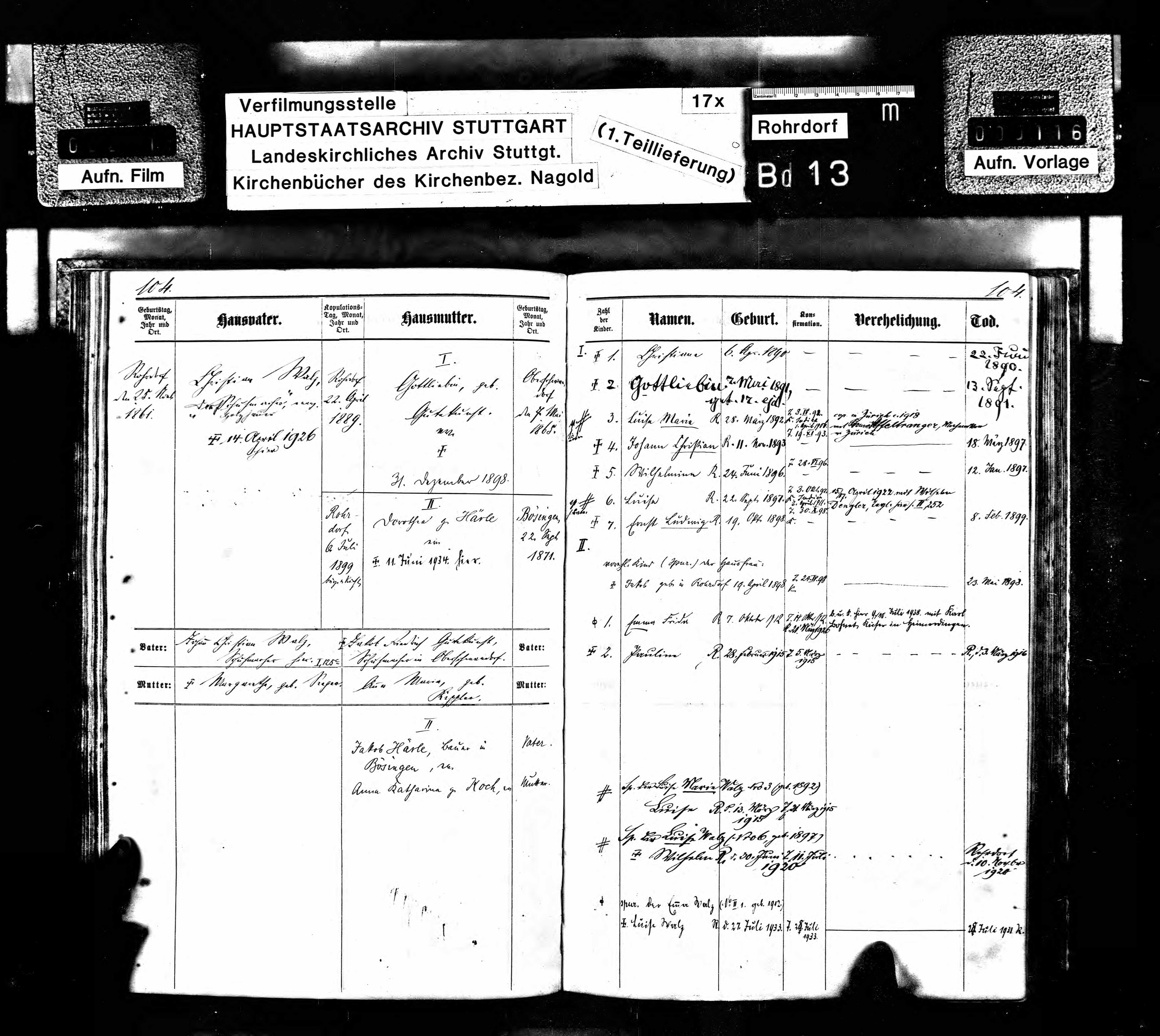 Geboren: 6 Apr. 1890 - Rohrdorf bei Nagold Getauft: Gestorben: 22 Jun. 1890 - Rohrdorf bei Nagold Bestattet: 24 Jun. 1890 - Rohrdorf bei Nagold