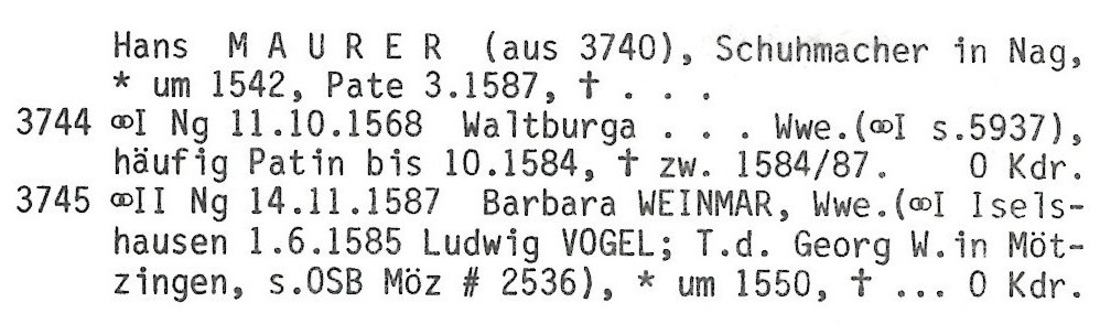 1. *Catharina Maurer* Ehe: U. 1540 Kinder: 1. Barbara Maurer 2. Hans Maurer 3. Catharina Maurer 4. Margaretha MaurerCatharina Maurer*