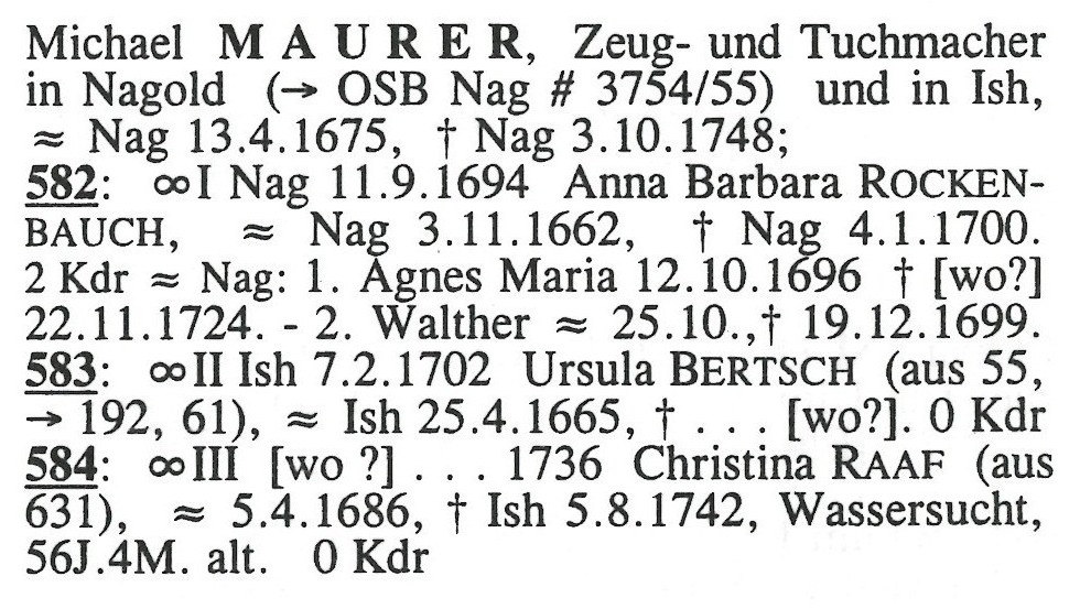 1. Ursula Bertsch Ehe: 7 Feb. 1702 - Iselshausen, Nagold, Schwarzwaldkreis, WürttembergRamey Maurer