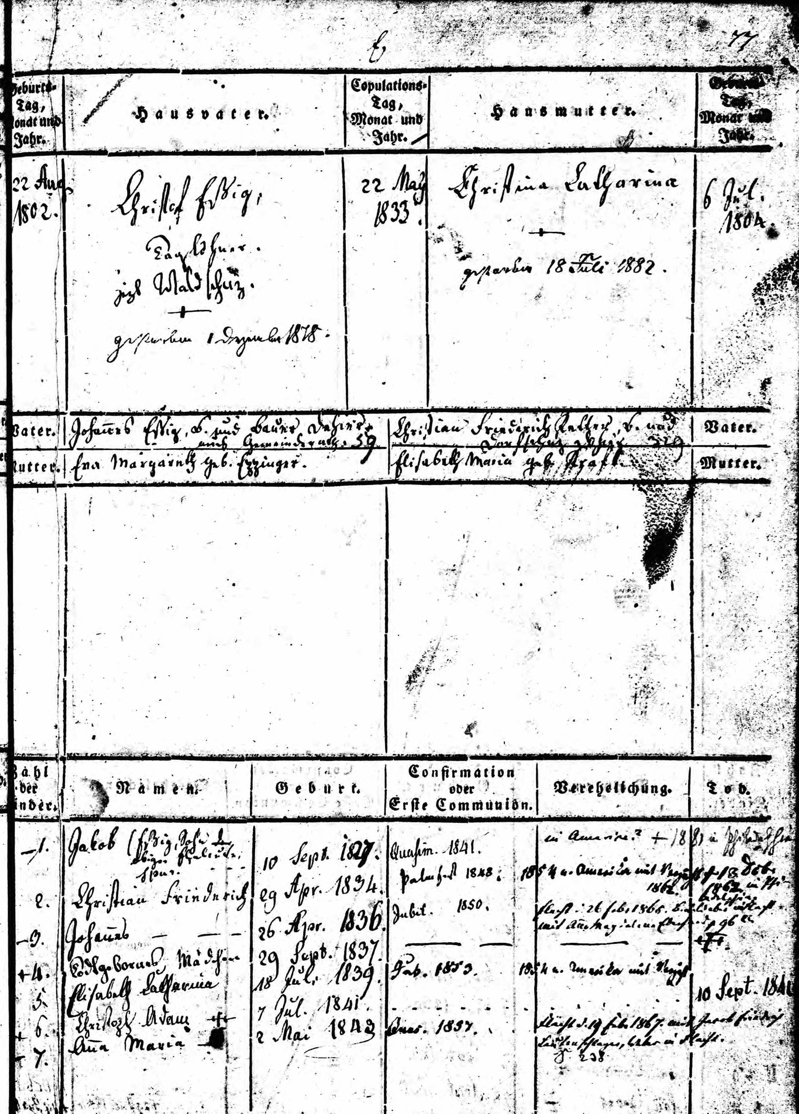 1. *Christoph Essig Ehe: 22 Mai 1833 - Flacht Kinder: 1. Jacob Essig 2. Christian Friederich Essig 3. Johannes Essig 4. Elisabeth Catharina Essig 5. Christoph Adam Essig †° 6. Anna Maria EssigChristina Margaretha Retter