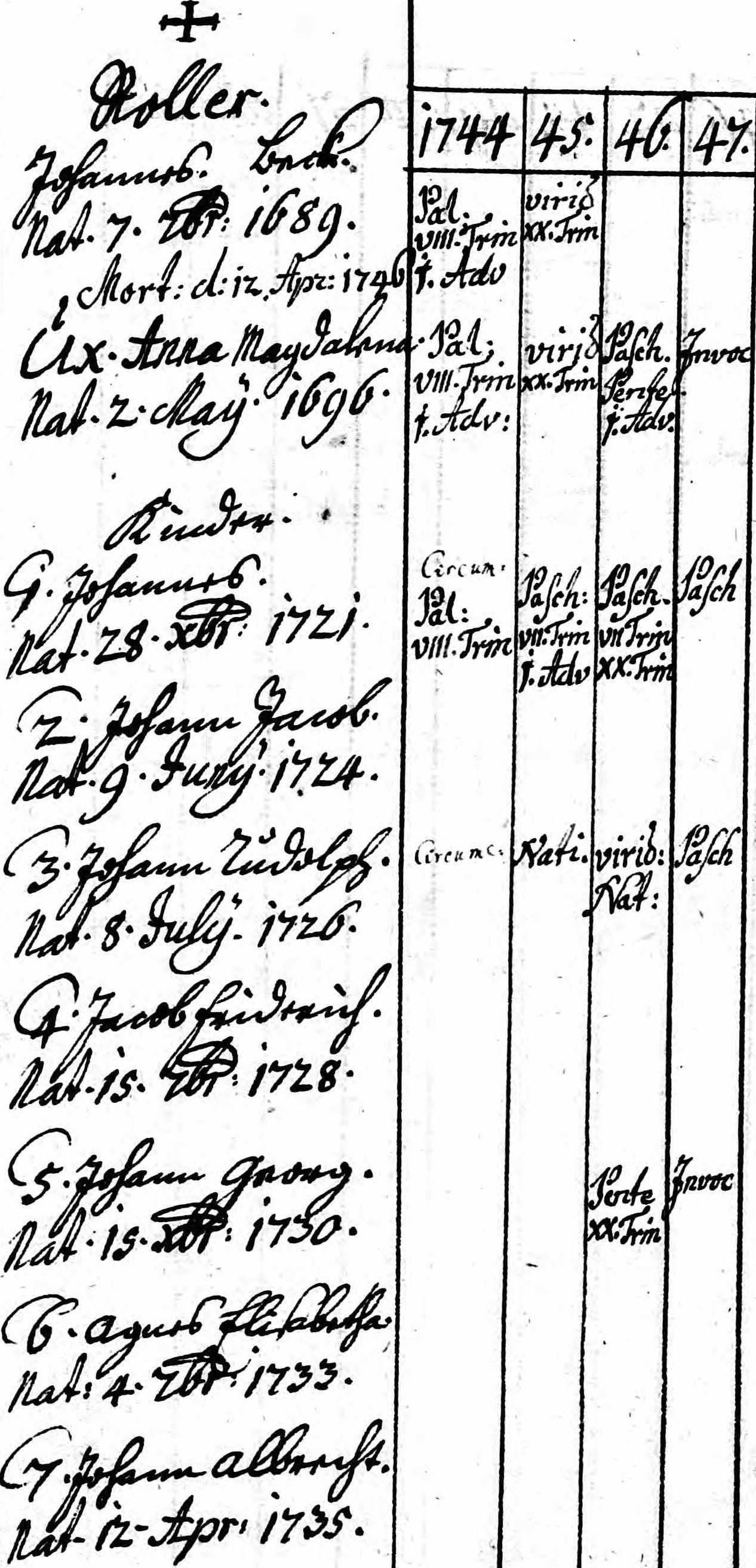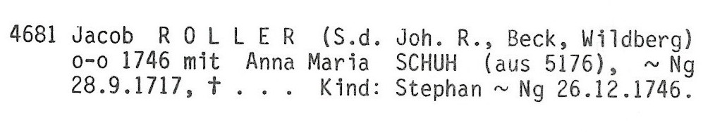 1. *Anna Magdalena Memminger Ehe: 4 Feb. 1721 - Wildberg Kinder: 1. Johannes Roller 2. Jacob Roller 3. Johann Rudolph Roller 4. Jacob Friedrich Roller 5. Johann Georg Roller 6. Agnes Elisabetha Roller 7. Johann Albrecht Roller