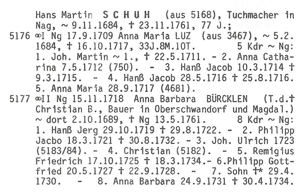 1. *Anna Maria Luz Ehe: 17 Sep. 1709 - Nagold Kinder: 1. Johann Martin Schuh †° 2. Anna Katharina Schuh 3. Hanß Jacob Schuh †° 4. Hanß Jacob Schuh †° 5. Anna Maria Schuh 2. *Anna Barbara Bürcklen Ehe: 15 Nov. 1718 - Nagold Kinder: 1. Hanß Jerg Schuh †² 2. Philipp Jacob Schuh .† 3. Johann Ulrich Schue 4. Christian Schue 5. Remigius Friedrich Schuh † 6. Philipp Gottfried Schuh †¹ 7. (Sohn) Schuh †* 8. Anna Barbara Schuh †²Hans Ulrich Schuh