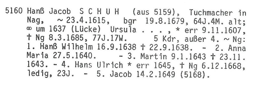 1. *Ursula Schuh* Ehe: U. 1637 Kinder: 1. Hanß Wilhelm Schuh †° 2. Anna Maria Schuh 3. Martin Schuh †° 4. Hans Ulrich Schuh 5. Hans Jacob SchuhHanß Jerg Schuh †²