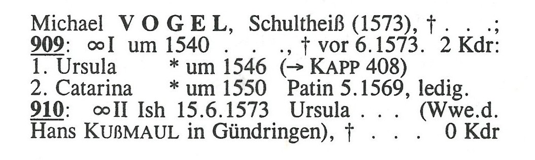 1. *Hans Kapp Ehe: 5 Jul. 1568 - Iselshausen, Nagold, Schwarzwaldkreis, Württemberg Kinder: 1. Hans Kapp 2. Barbara Kapp 3. Jerg Kapp 4. Michael Kapp 5. Jacob Kapp 6. Margaretha Kapp 7. Gabel Kapp 8. Bathasar KappUrsula Vogel*