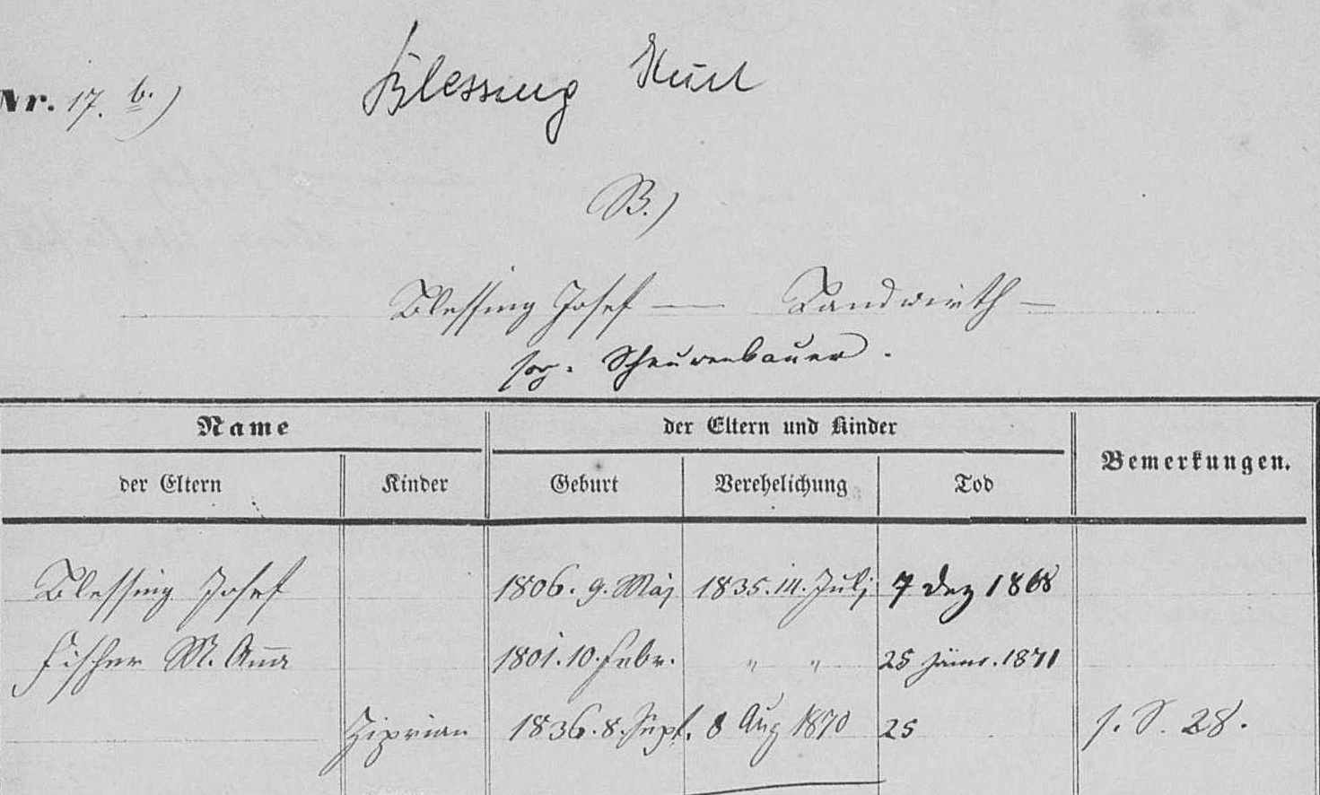 1. *Josef Blessing Ehe: 14 Jul. 1835 - Tannheim Kinder: 1. Zyprian BlessingMaria Anna Fischer