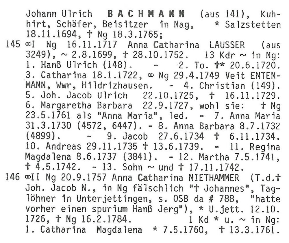 1. *Anna Maria Kußmaul Ehe: 24 Jan. 1719 - Mötzingen, Schwarzwaldkreis, Württemberg Kinder: 1. Johann Jacob Bachmann 2. Catharina Bachmann 3. Ludwig Bachmann †° 4. Johannes Bachmann 5. Georg Friedrich Bachmann †¹ 6. Maria Barbara Bachmann 7. Maria Bachmann 8. Magdalena Bachmann 9. Margaretha Bachmann 10. Johann Georg BachmannJohannes Bachmann